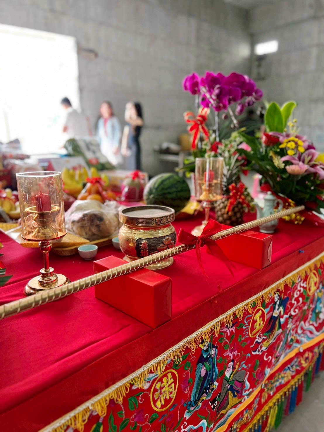 金色的樑繫上喜氣的紅結,在陽光下熠熠生輝。